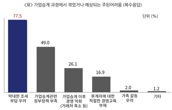 그렇다면 가업승계를 가로막는 주된 장애 요인은 무엇일까요? 중소기업중앙회 「2019 가업승계 실태조사 보고서에 따르면 가업승계 과정에서 겪었거나 예상되는 주된 어려움으로는 가업승계시 상속세 및 증여세 등 막대한 조세부담 우려(77.5%)'이고, 다음으로는 ‘가업승계관련 정부 정책 부족 (49.0%), 가업승계 이후 경영악화(거래처 축소 등) (26.1%) 등의 순으로 나타났습니다.